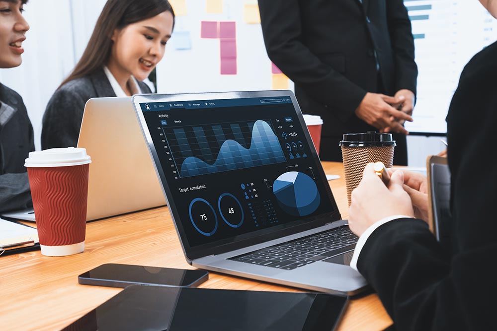 Multiracial analyst team use BI Fintech software to analyze financial data on meeting table. Financial dashboard data display on laptop screen with analyzed chart for marketing indication. Concord
